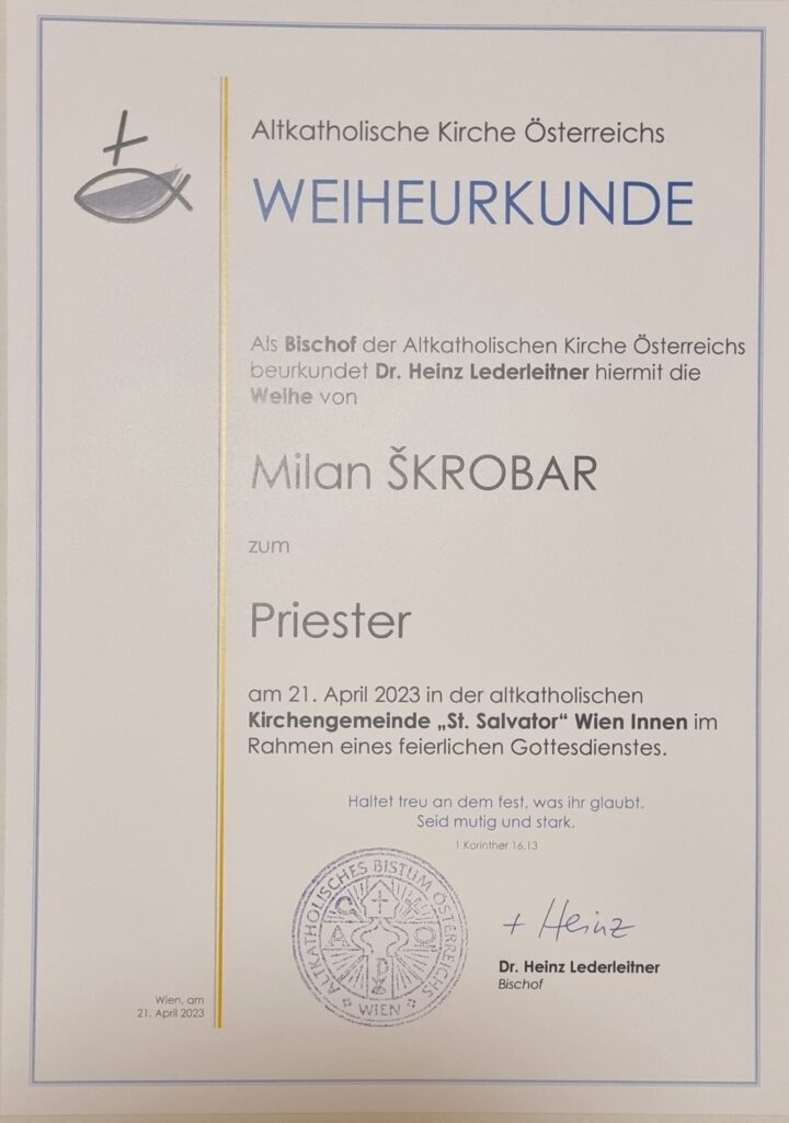 Sem namreč pripadnica Rimokatoliške cerkve in tudi sama, do pred nekaj let, nisem vedela za obstoj Starokatoličanov. To sem zvedela, ko sem spoznala župnika Milana Škrobarja in, preko njega, tudi druge naše brate in sestre v Kristusu, ki pripadajo mariborski starokatoliški župniji.